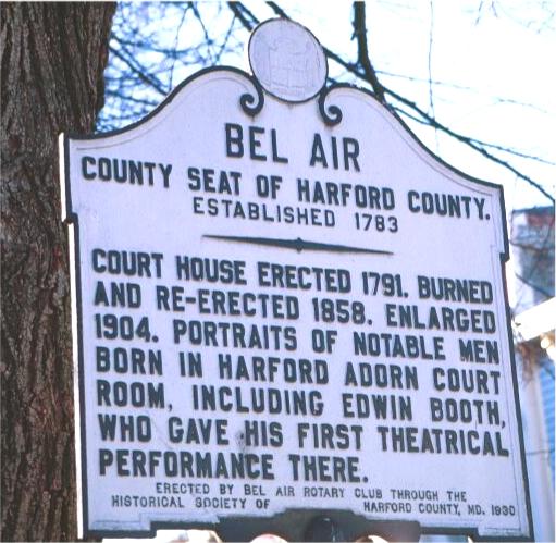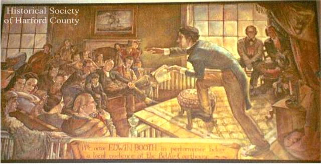 Booth Room Committee Tour of Booth Family Historic Sites I. Harford County Researched and Written by Dinah Faber March 2002 Part of the mission of the Booth Room Committee is the encouragement of the preservation those sites important to the history of the Booth family, especially those places in Maryland. Thus, this page is devoted to providing accurate information on some of those sites. Harford CountyEdwin Booth MuralLocation:Bel Air Post Office; Postal Clerks' Lobby; 202 Blum Court; Bel Air, Maryland, 21014Hours: Monday thru Friday 8:00 A. M. to 6:00 P.M.; Saturday 8:00 A.M. to 2:00 P.M.; Sunday Closed ![]() Description: The inscription which is included in this painting reads,